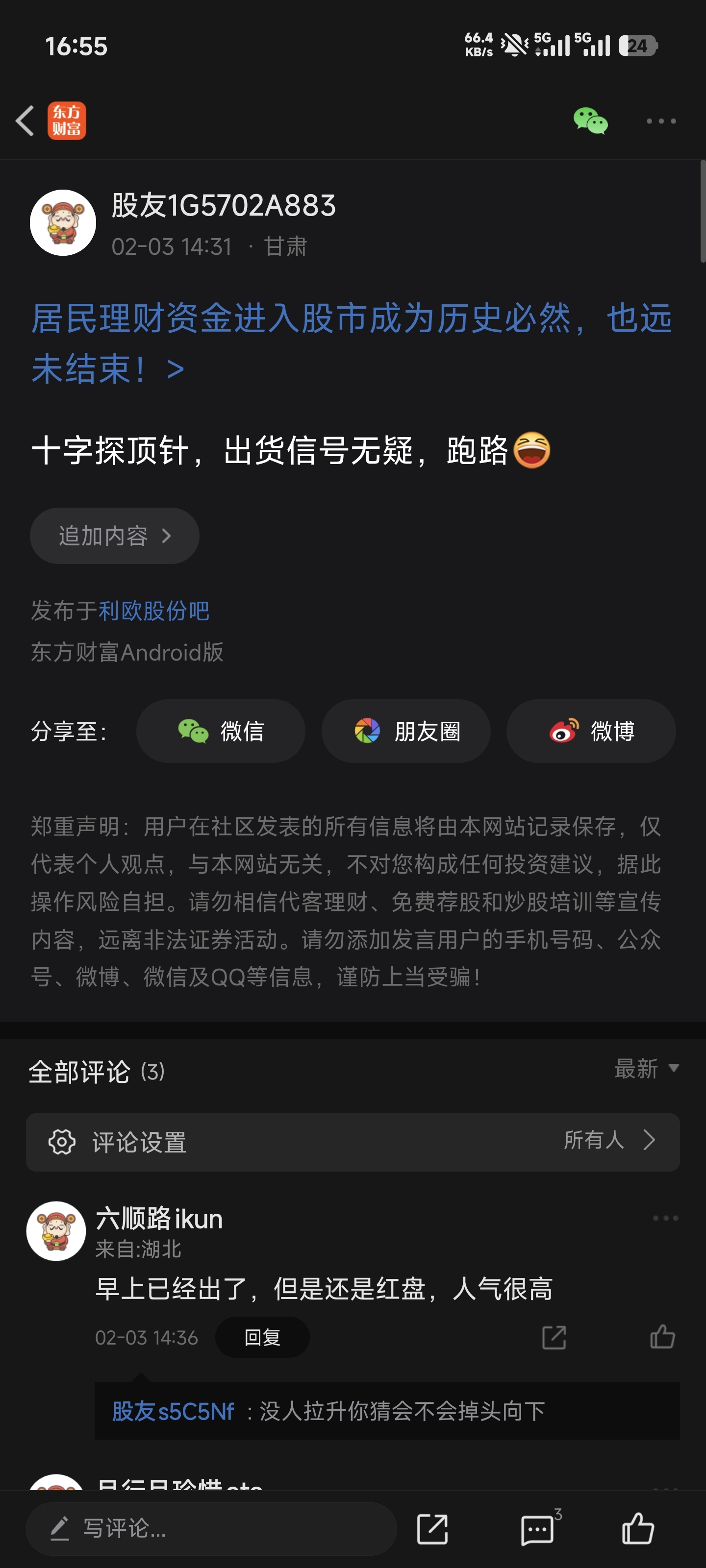 温馨提示: 1.根据《证券法》规定,禁止编造、传播虚假信息或者误导性信息,扰乱证券市场;2.用户在本社区发表的所有资料、言论等仅代表个人观点,与本网站立场无关,不对您构成任何投资建议。用户应基于自己的独立判断,自行决定证券投资并承担相应风险。《东方财富社区管理规定》