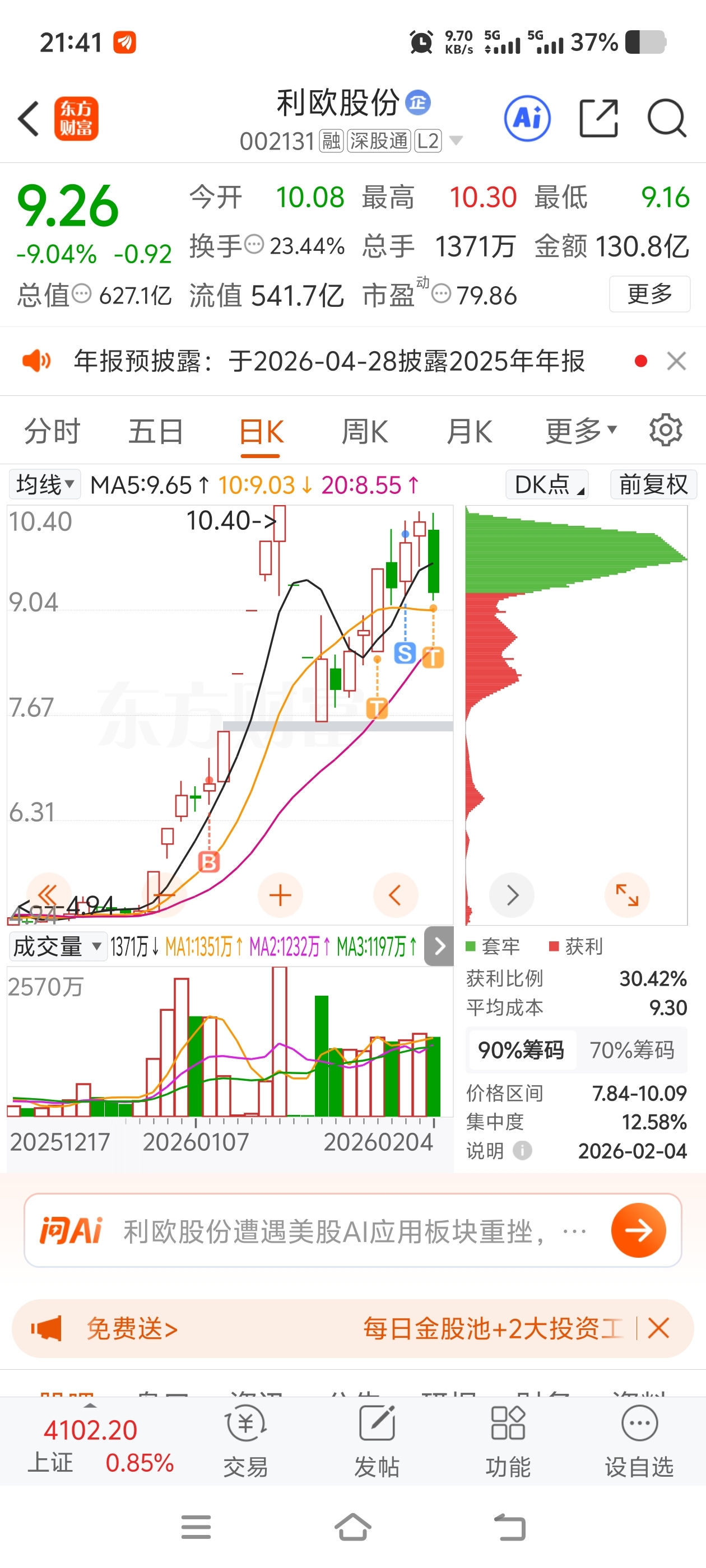 后悔前天只卖了一半,今天还做了一个反T!我觉得欧皇会在九到十元之间来回震荡,不打