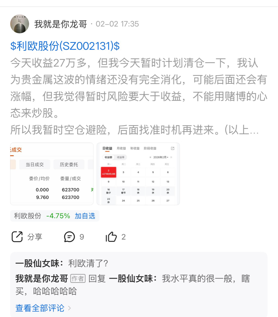 我2月2号清仓了600多万利欧股份,虽然不是卖在了最高点,但躲过了这2天的大跌。