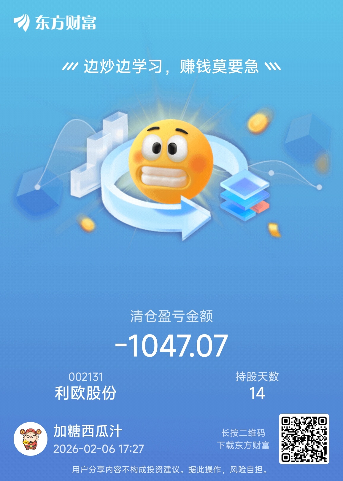 温馨提示: 1.根据《证券法》规定,禁止编造、传播虚假信息或者误导性信息,扰乱证券市场;2.用户在本社区发表的所有资料、言论等仅代表个人观点,与本网站立场无关,不对您构成任何投资建议。用户应基于自己的独立判断,自行决定证券投资并承担相应风险。《东方财富社区管理规定》