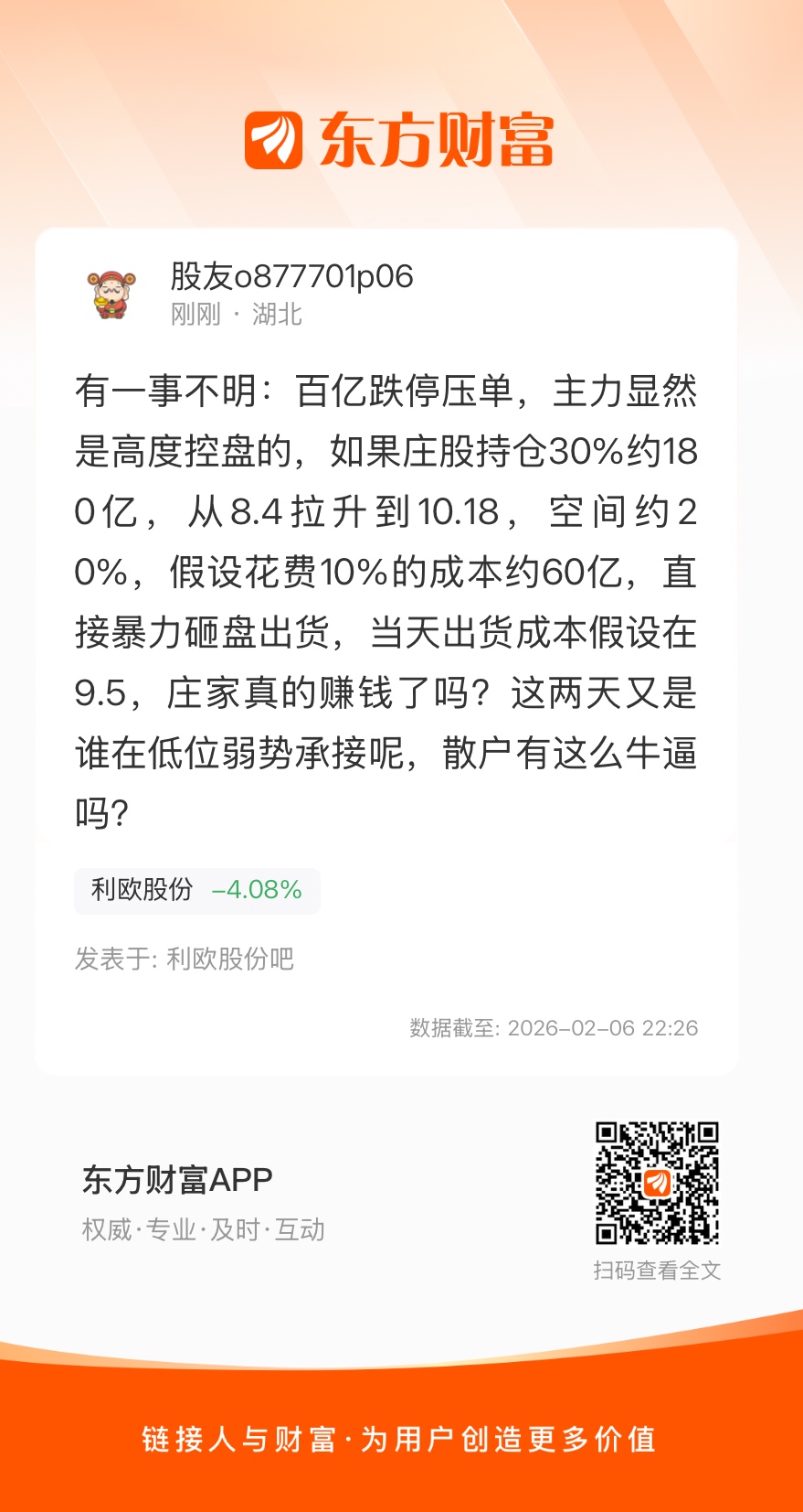 温馨提示: 1.根据《证券法》规定,禁止编造、传播虚假信息或者误导性信息,扰乱证券市场;2.用户在本社区发表的所有资料、言论等仅代表个人观点,与本网站立场无关,不对您构成任何投资建议。用户应基于自己的独立判断,自行决定证券投资并承担相应风险。《东方财富社区管理规定》