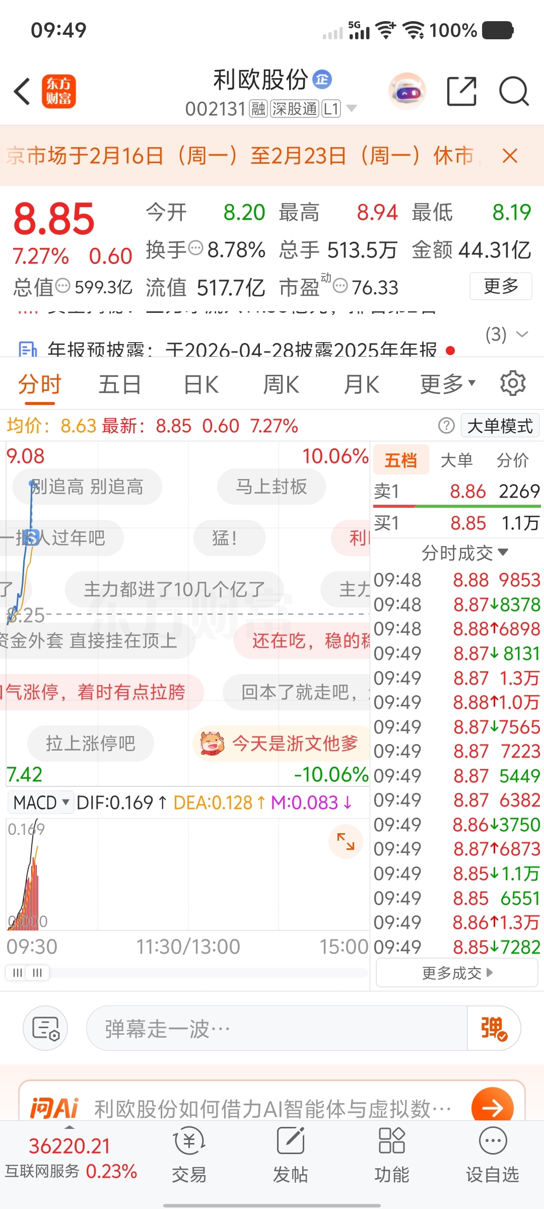 $利欧股份(SZ002131)$ 挂8.88,刷抖音两分钟就卖了