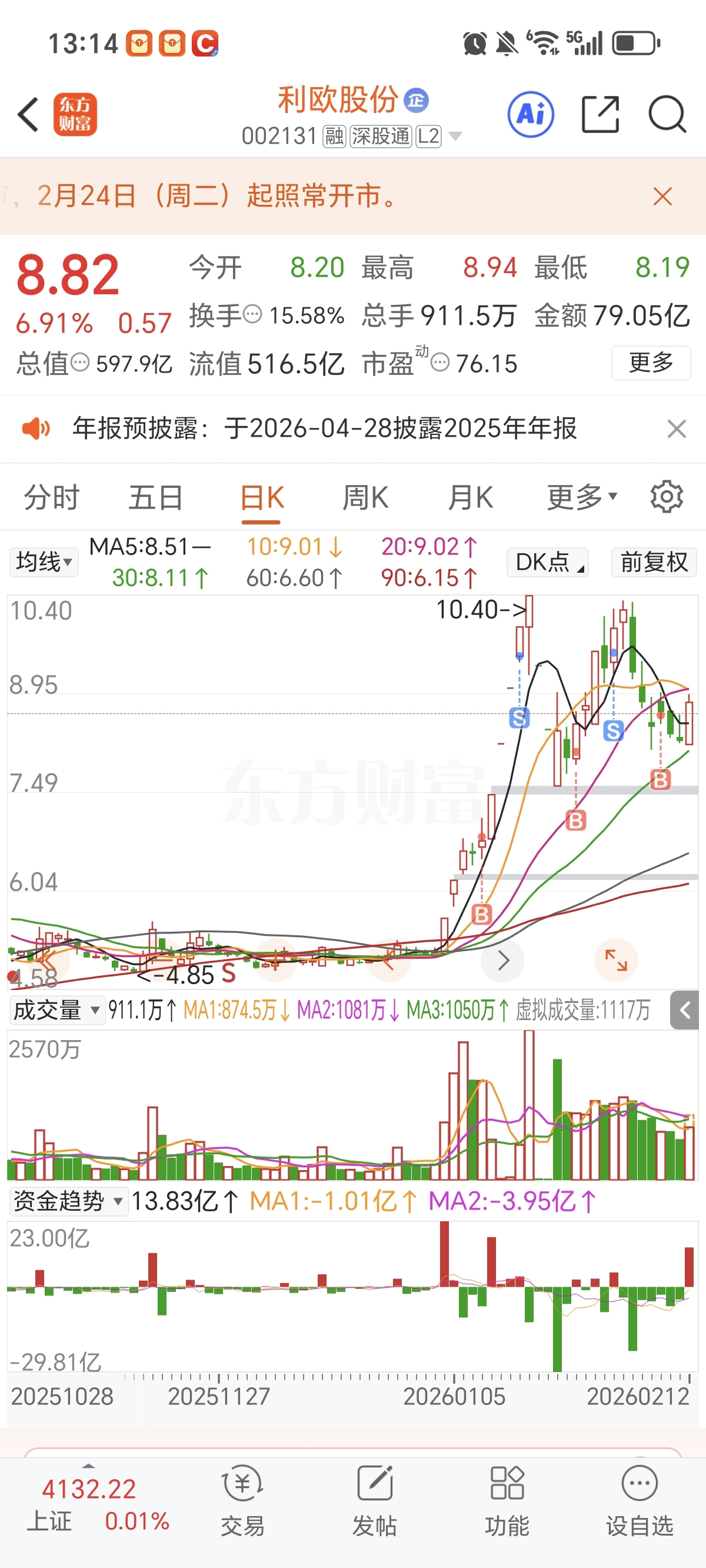 $利欧股份(SZ002131)$ 不频繁操作 耐心持有