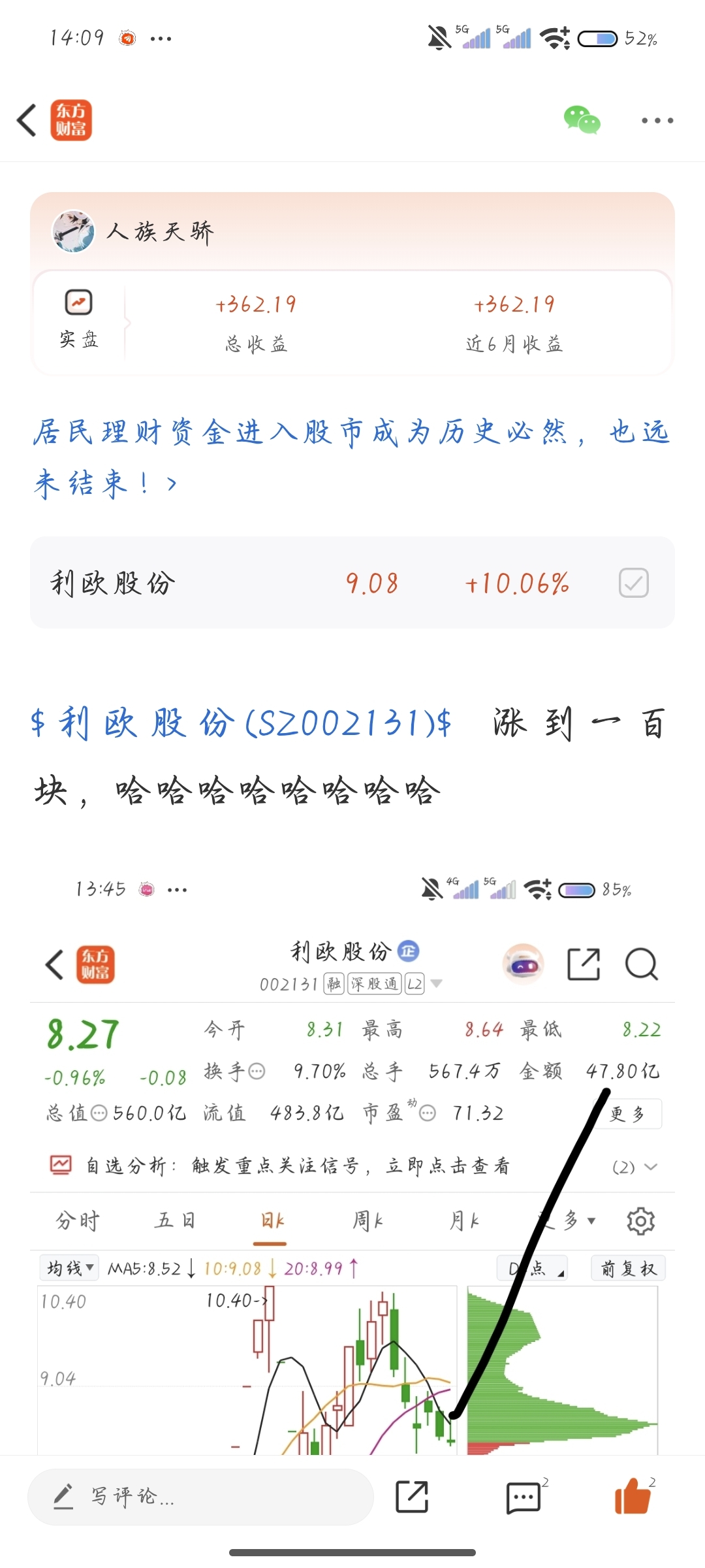 $利欧股份(SZ002131)$ 哈哈哈哈,欧皇!涨到一百块!