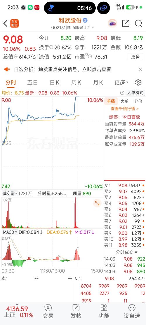 我在封板前几分钟全仓了,因为看到那几秒打出80万手,但还好很多人卖,一下子没封住。我买入后,一下子一百多万手来了,直接封了。瞬间封单475万手,加上几次拉伸的成交,小百亿补贴了。
