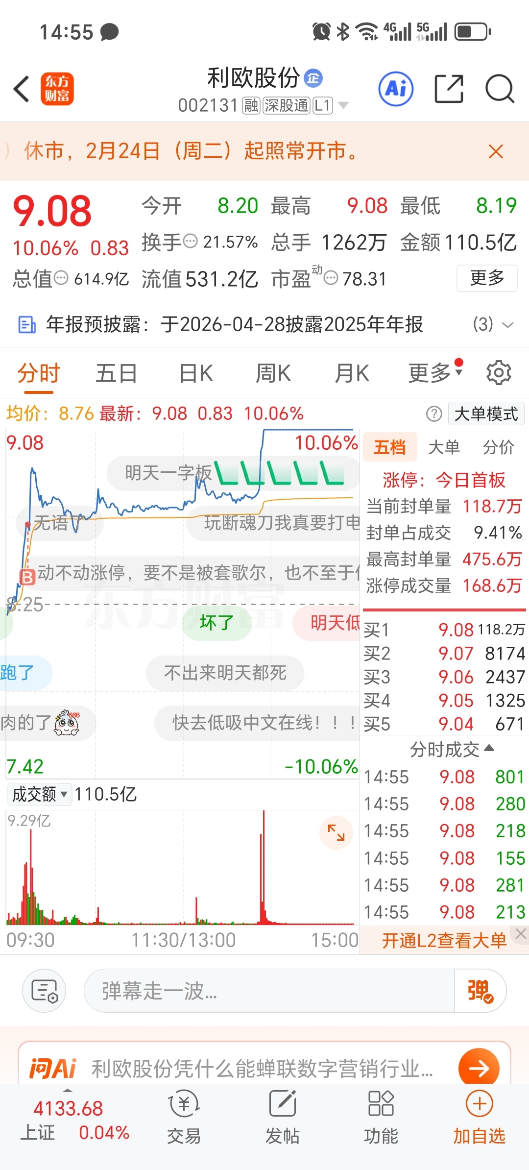 差点以为今天要挂了,还好涨停了,昨天半路上的再升科技,还好集合竞价卖了。