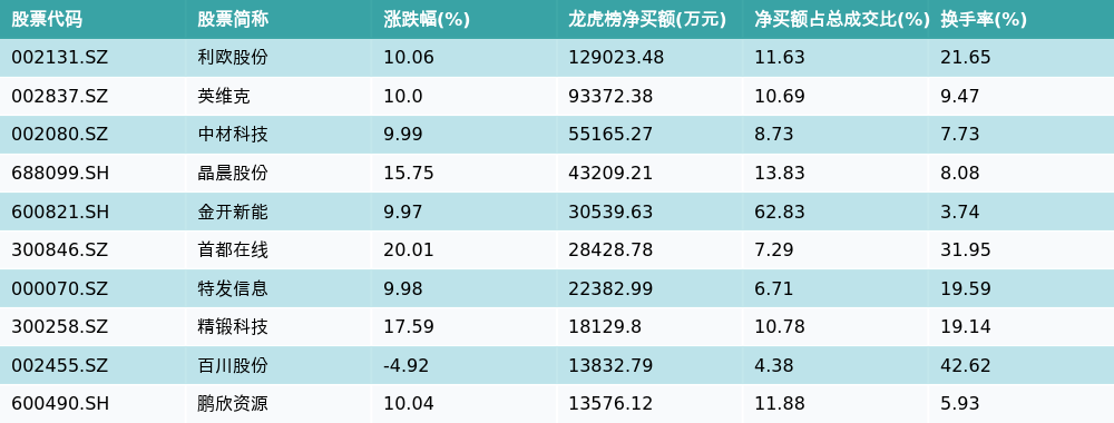 南财智讯2月12日电,盘后数据显示,因当日异动登上龙虎榜的个股中,资金净买入最多的前三位分别是利欧股份(002131.SZ)、英维克(002837.SZ)与中材科技(002080.SZ)。其中排名第一的利欧股份净买额达12.9亿元,占总成交金额的11.63%。利欧股份当日收盘上涨10.06%,换手率为21.65%,净买入额前10个股详情见下图: