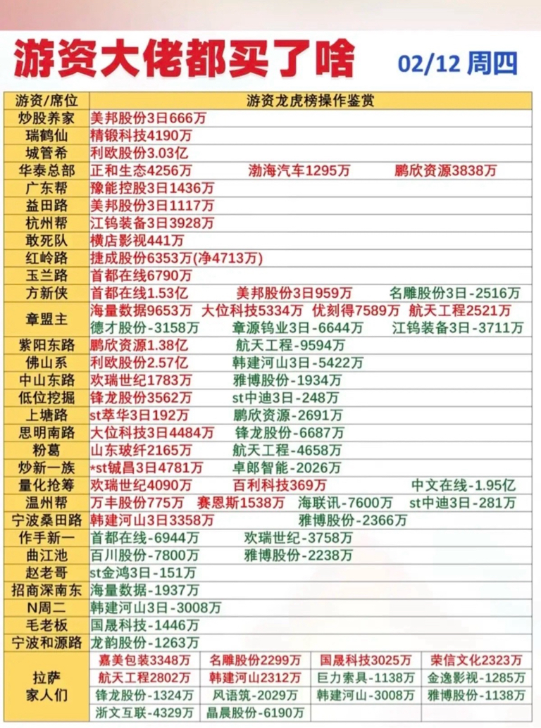 2.12周四游资抢筹龙虎榜!看看游资大佬们都买了啥股票?!液冷,算力,商业航天电