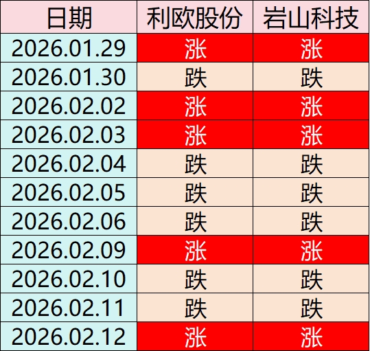 $岩山科技(SZ002195)$ $利欧股份(SZ002131)$ 韭菜兄弟们,看图片统计,从1月29号到今天,利欧-岩山的涨跌节奏完全一致,这两只票就是标准的高低配