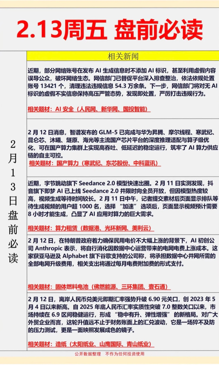 2月13日周五盘前梳理AI治理趋严,国产算力突破;字节AI爆火显需求,初创企业自