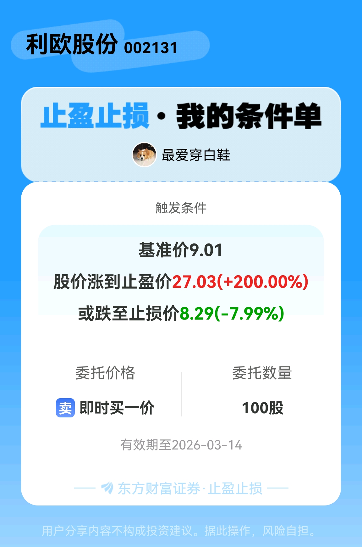 #条件单交流# #止盈止损晒单# 一位股神设置了一个止盈止损条件单,接下来就是见证奇迹的时刻~$利欧股份(SZ002131)$
