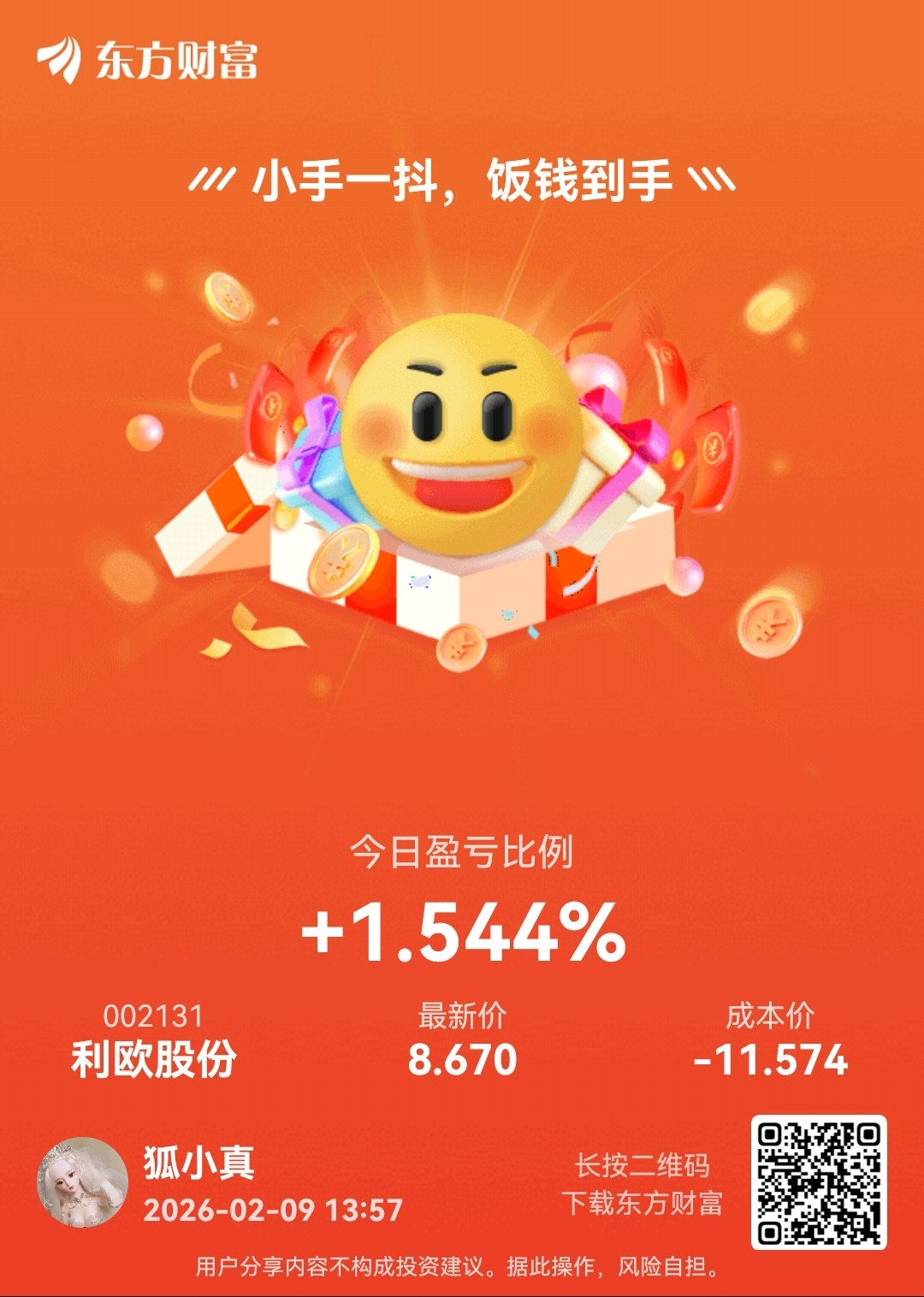 利欧股份谢谢你好喜欢你今天把成本价又便宜了1块钱上次最低成本价-11块多,今天-