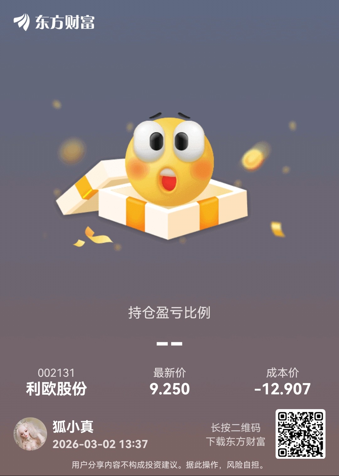 温馨提示: 1.根据《证券法》规定,禁止编造、传播虚假信息或者误导性信息,扰乱证券市场;2.用户在本社区发表的所有资料、言论等仅代表个人观点,与本网站立场无关,不对您构成任何投资建议。用户应基于自己的独立判断,自行决定证券投资并承担相应风险。《东方财富社区管理规定》
