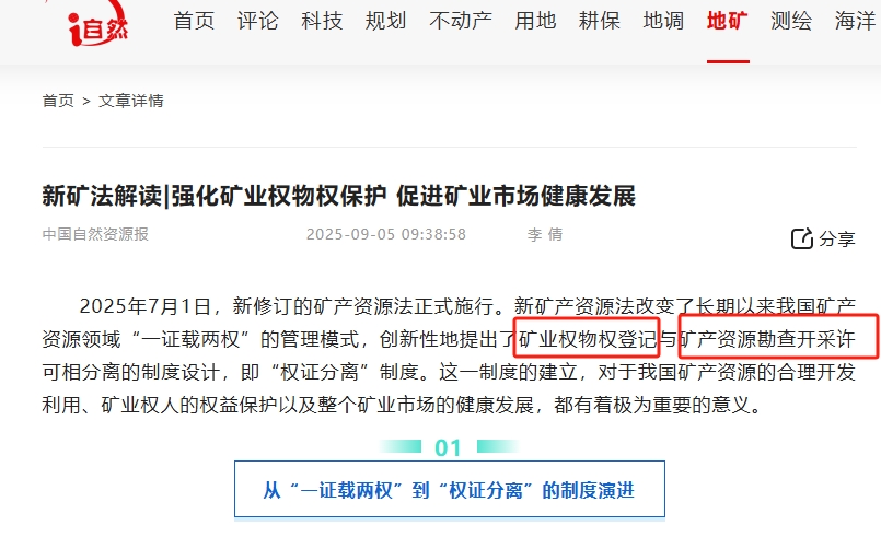 2025年新矿产资源法将物权登记与勘查开采许可相分离,先办物权证,再办采矿证。