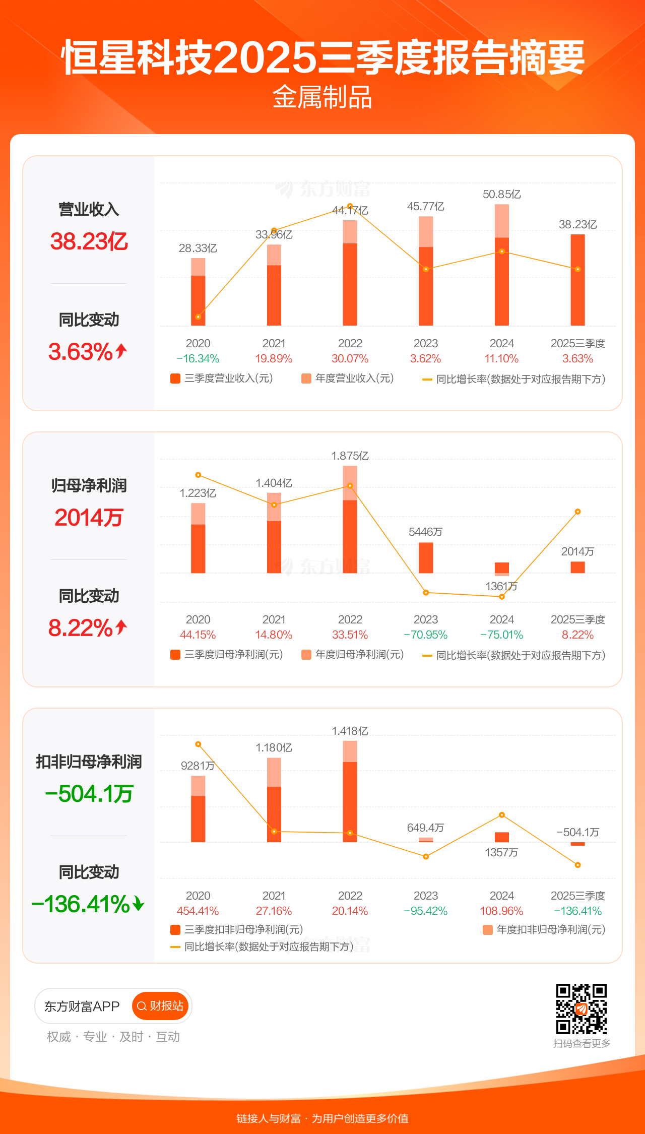 恒星科技10月29日发布2025年三季报显示,公司前三季实现营业收入38.23亿元,同比增长3.63%;归母净利润2014.17万元,同比增长8.22%;扣非归母净利润-504.07万元。