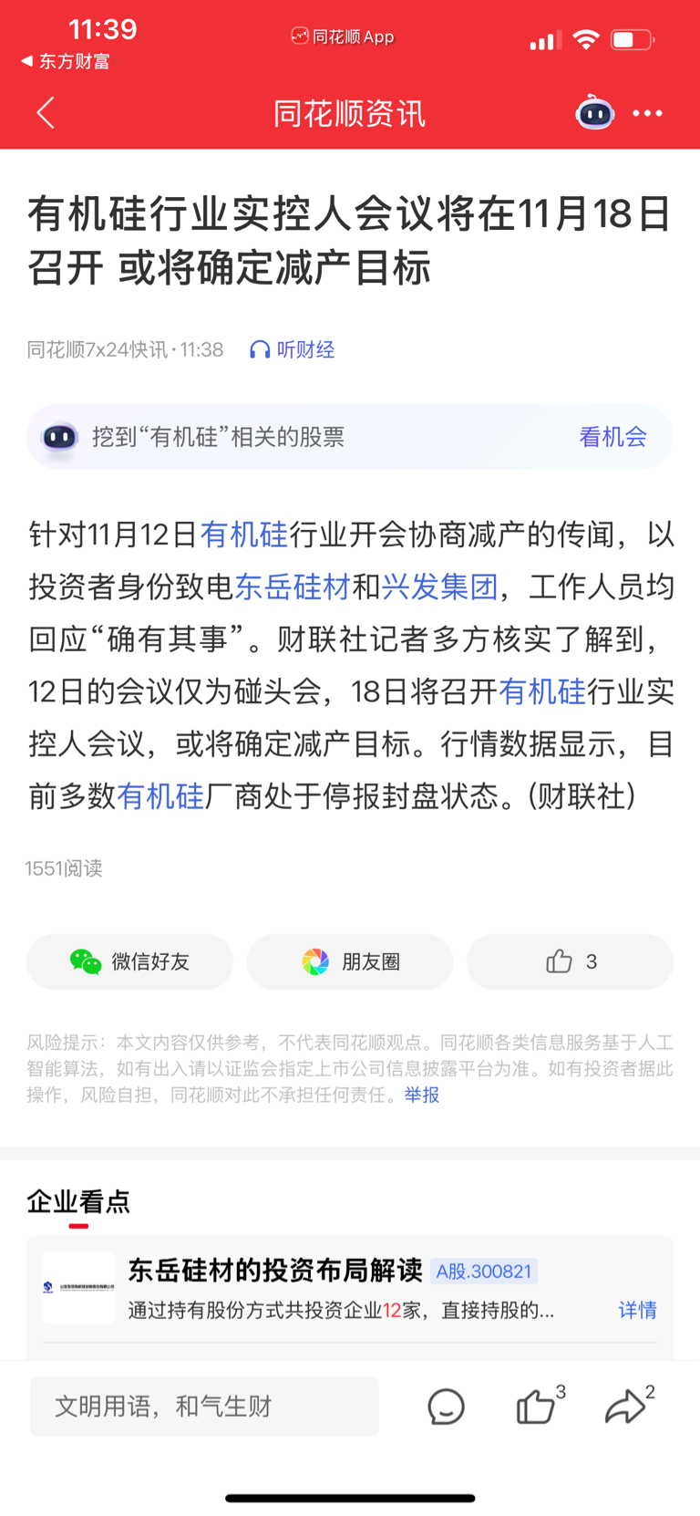 $恒星科技(SZ002132)$ 有机硅反内卷,有机硅减产,提升价格针对11月12日有机硅行业开会协商减产的传闻,以投资者身份致电东岳硅材和兴发集团,工作人员均回应“确有其事”。财联社记者多方核实了解到,12日的会议仅为碰头会,18日将召开有机硅行业实控人会议,或将确定减产目标。行情数据显示,目前多数有机硅厂商处于停报封盘状态。(财联社)