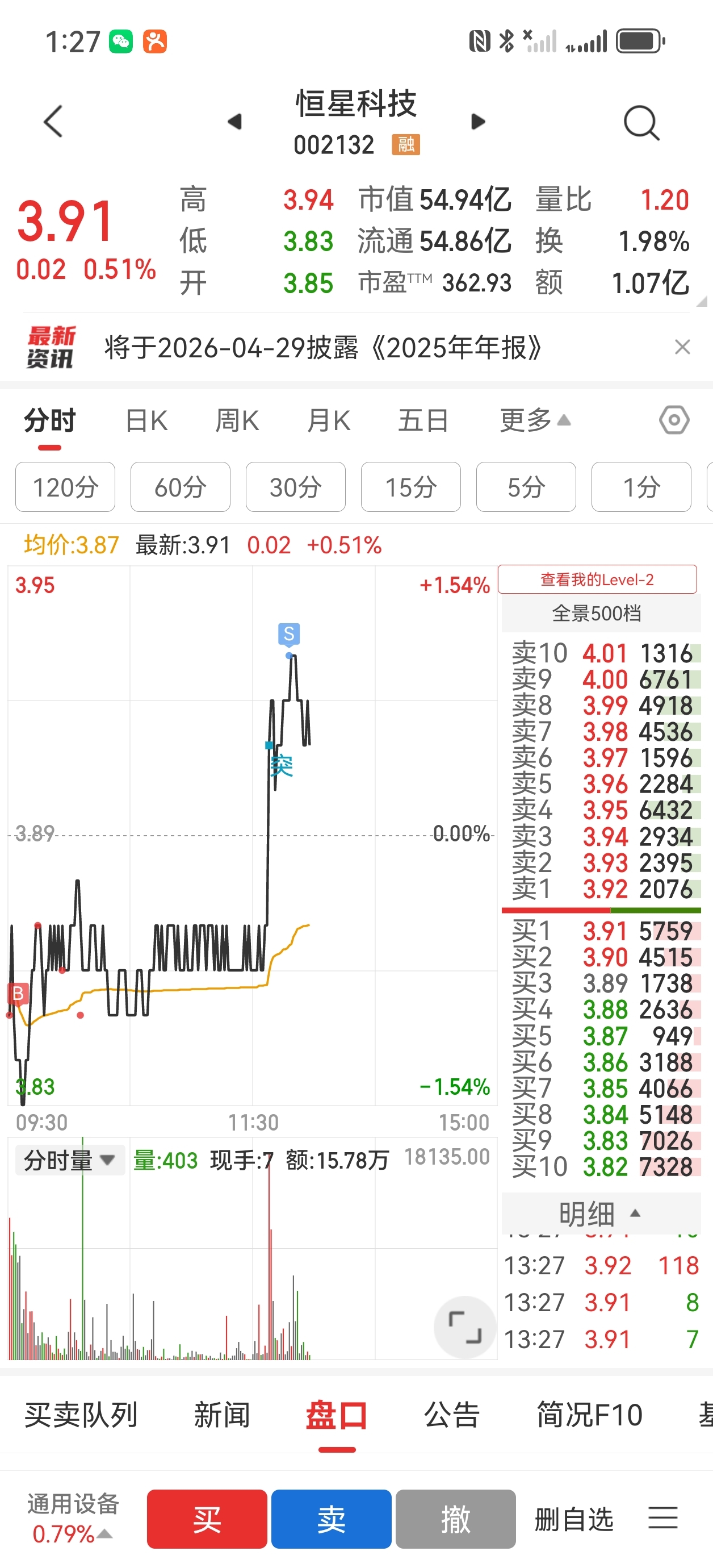 $恒星科技(SZ002132)$ 明天薅几分,一分也是爱