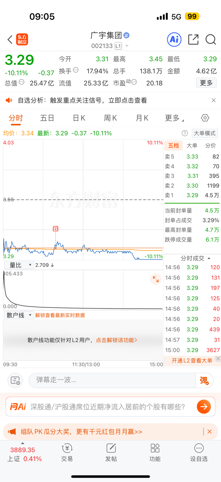 $广宇集团(SZ002133)$ 净流入怎么会跌停呢,被骗了
