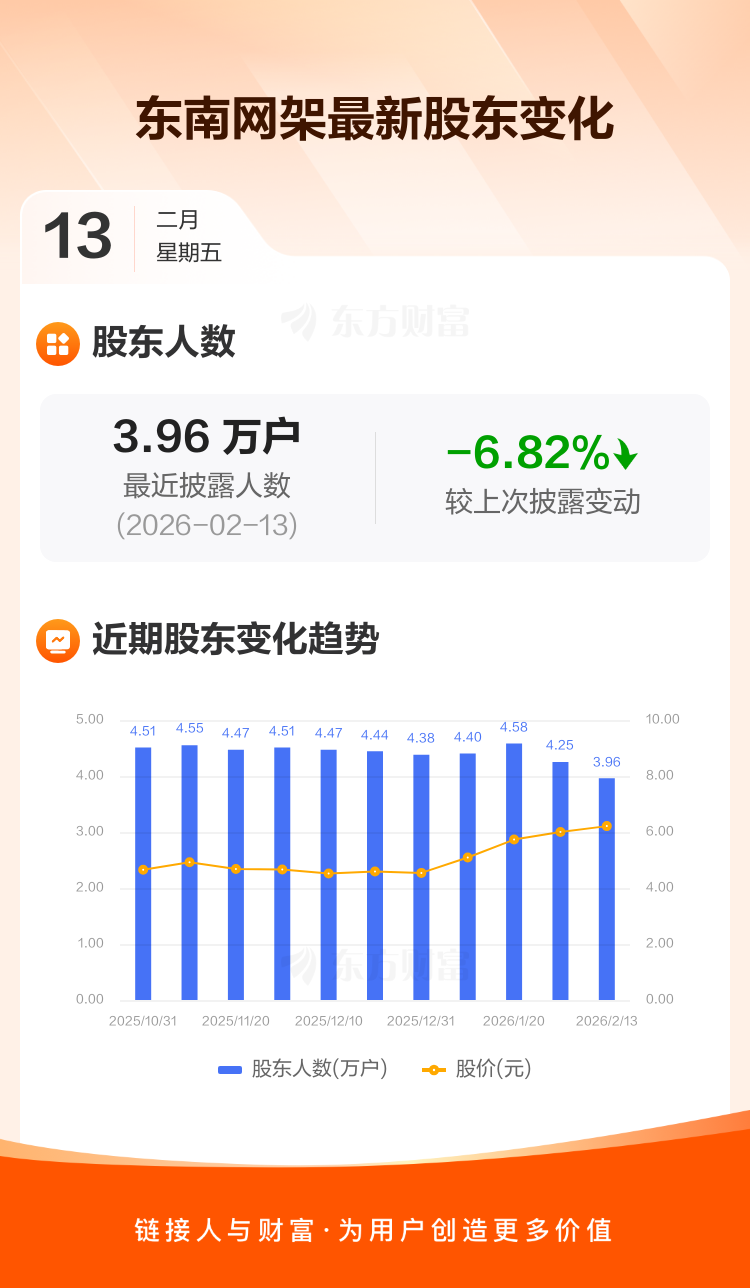 东南网架最新披露数据显示,截至2月13日公司股东户数为3.96万户,较上期(2026年1月30日)减少2900户,降幅为6.82%。户均持有流通股数量由上期的2.46万股上升至2.64万股,户均持股金额由上期的14.74万元增加至16.37万元。