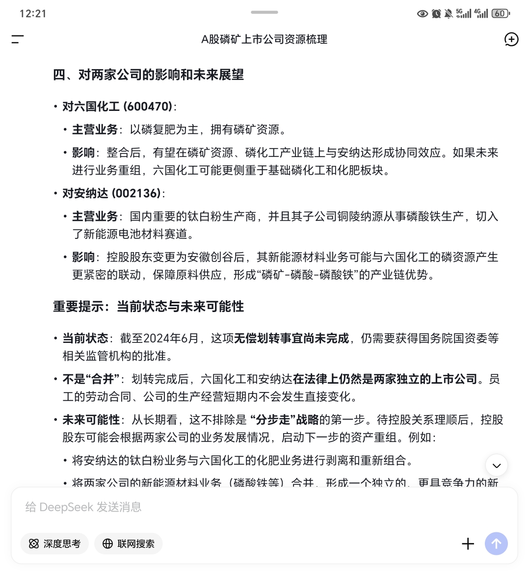 $安 纳 达(SZ002136)$ 六国化工投资的28万吨/年电池级精制磷酸项目,加快拓展磷酸铁锂正极材料前驱体磷酸铁产业,打破公司目前以基础肥料为主的业务格局,将磷资源向高端磷化产品倾斜,从而获得新的利润增长点。在万华化学电池的支持下,六国化工和安纳达将主要生产固态电池的材料,该两上市公司会合并在一起做强做大抵抗风险,因六国化工有规模大储存量丰富的磷矿,将由六国化工吸收安纳达