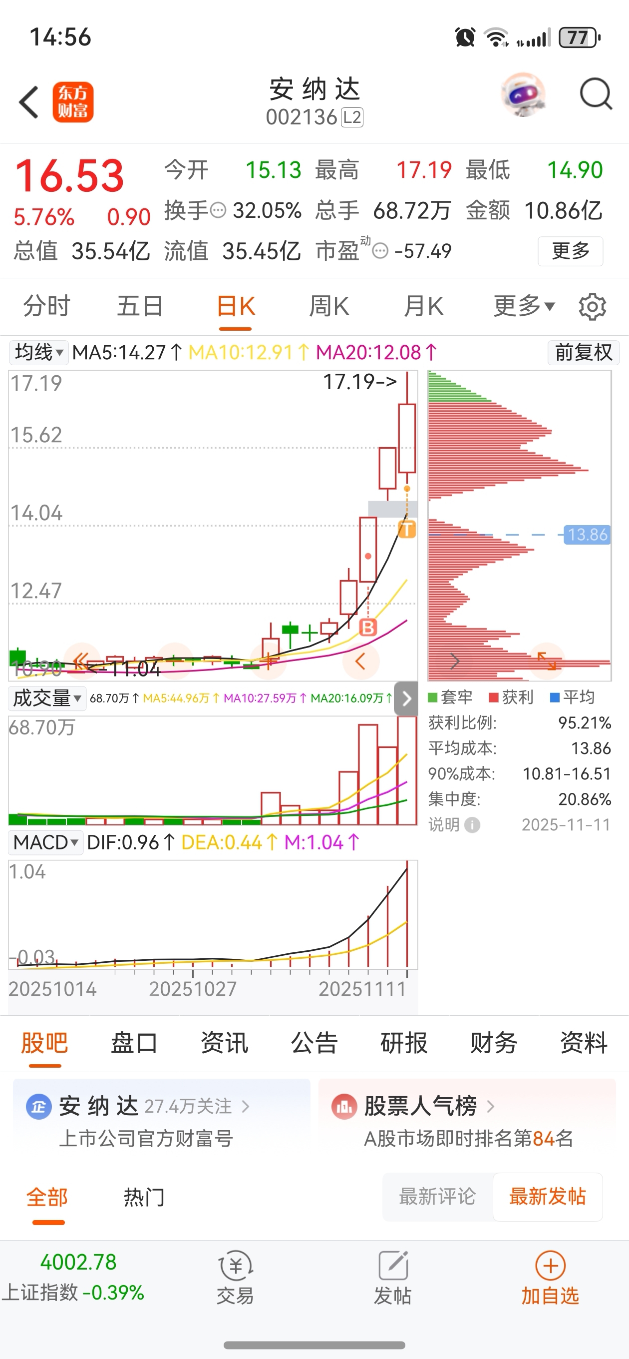 $安 纳 达(SZ002136)$ 走了,回调再进