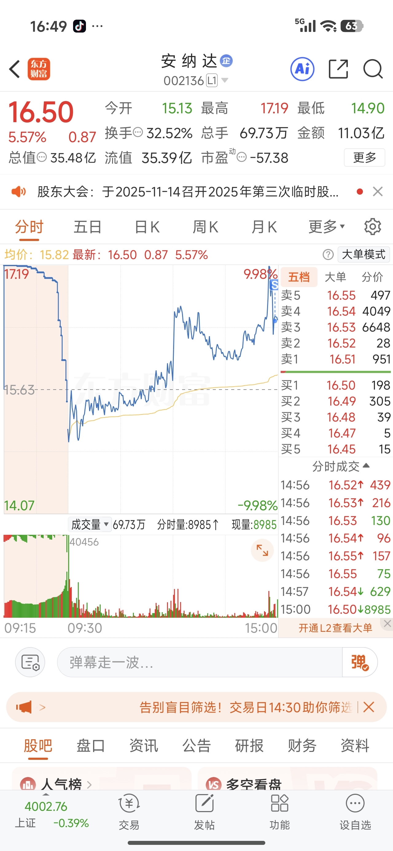 $安 纳 达(SZ002136)$ 走了,今天不冲高都没问题,可是封不住板就完蛋了