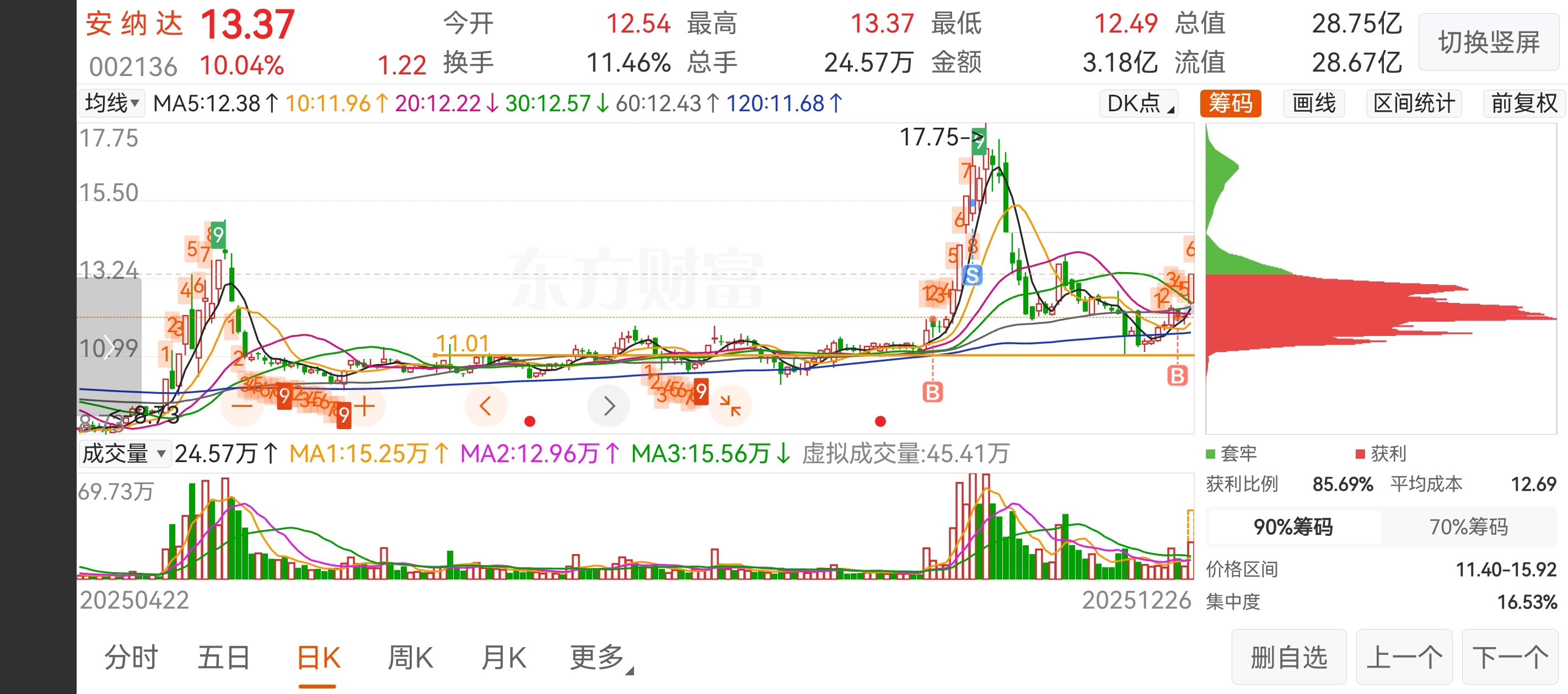 $安 纳 达(SZ002136)$ 再让我吃一波
