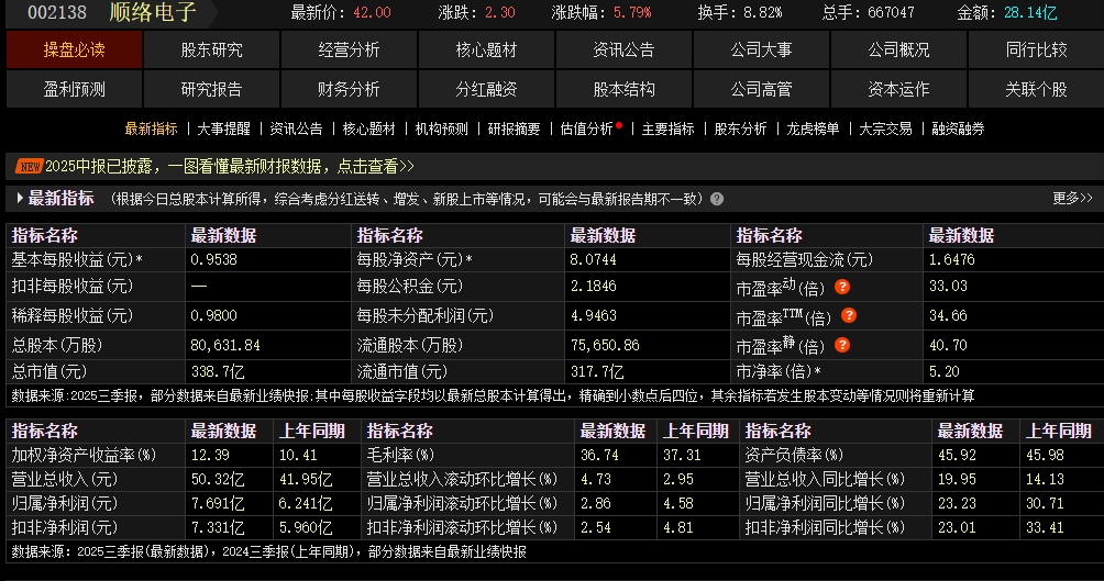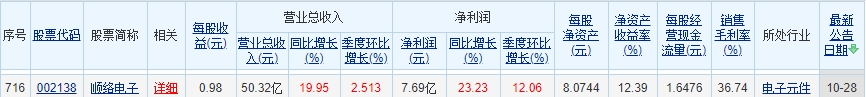 顺络电子三季度业绩显示: 实现营收50.32亿元,同比增长19.95%;实现净利润7.691亿元,同比增长23.23%;每股收益0.9538元。