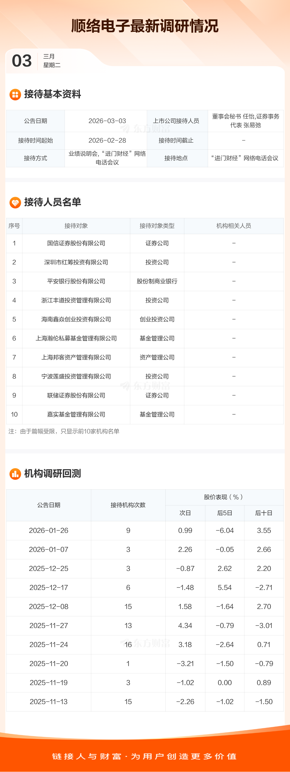 顺络电子3月3日公告称,2月28日接待国信证券股份有限公司等152家机构调研。接待人员包括董事会秘书 任怡,证券事务代表 张易弛。