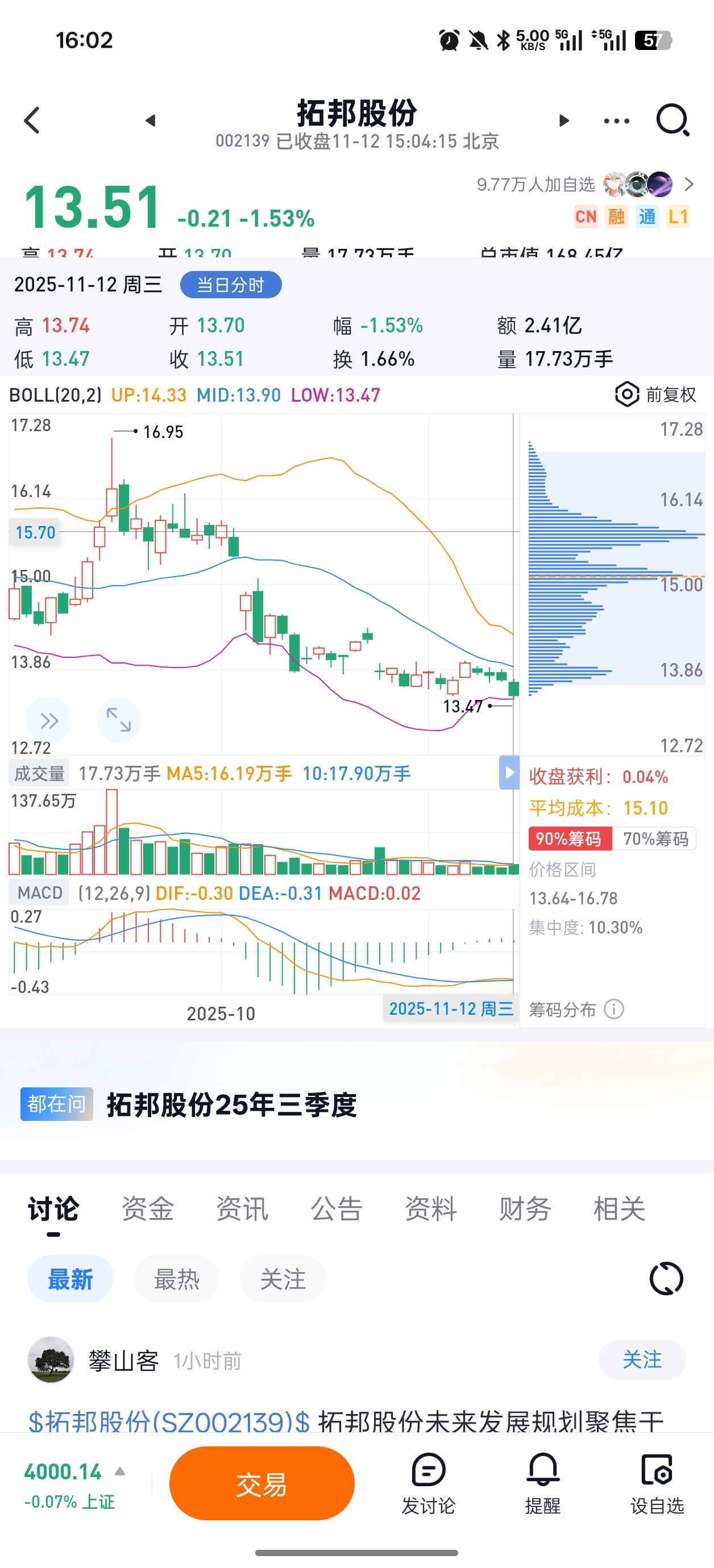 $拓邦股份(SZ002139)$ 筹码集中度10.30,昨日10.16,筹码峰上部没有松动,平均成本15.01,收盘获利0.04,动态市盈30,交易量低迷,买卖挂单多