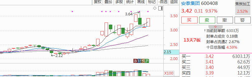 $安泰集团(SH600408)$,最近煤炭板块起落比较大,从板指上看,运行的还算健稳,尽管一步三回头,但总方向还是向上的,叠加冬季来临,用煤量增加,煤炭板块进入周期性行情,昨天再度回暖,涨停的就安泰集团一只,这段时间频频出现涨停板,今天最好是连板,但如果选择回撤,则到30日线也是合理的。