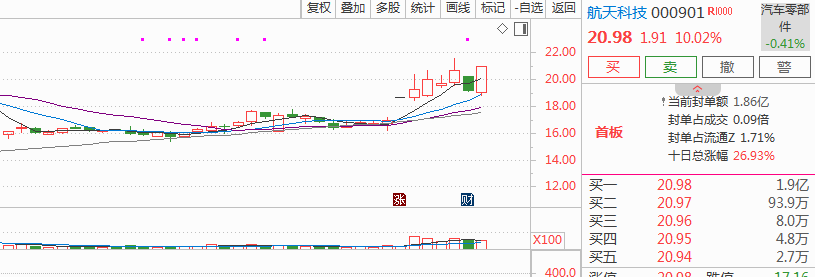 $航天科技(SZ000901)$,神舟二十一号载人飞船成功发射并进入预定轨道,同时,世界最大蒙皮拉伸机通过验收,实现0.1毫米级精度突破,11月1日公布明年将发射梦舟一号等4艘飞船计划。三个利好促发了昨天航天板块大涨,四只涨停,航天科技的看点是反包阳,承接了前面四连阳,退回来看,周五的阴线就是故意而为之了,但上板的时间太慢,应该是震荡上行行情。