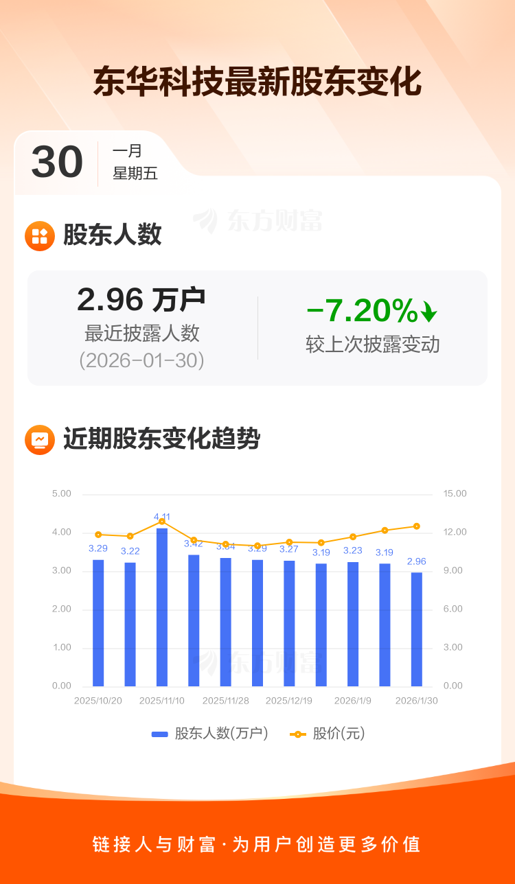 东华科技最新披露数据显示,截至1月30日公司股东户数为2.96万户,较上期(2026年1月20日)减少2300户,降幅为7.20%。户均持有流通股数量由上期的2.21万股上升至2.39万股,户均持股金额由上期的26.95万元增加至29.82万元。
