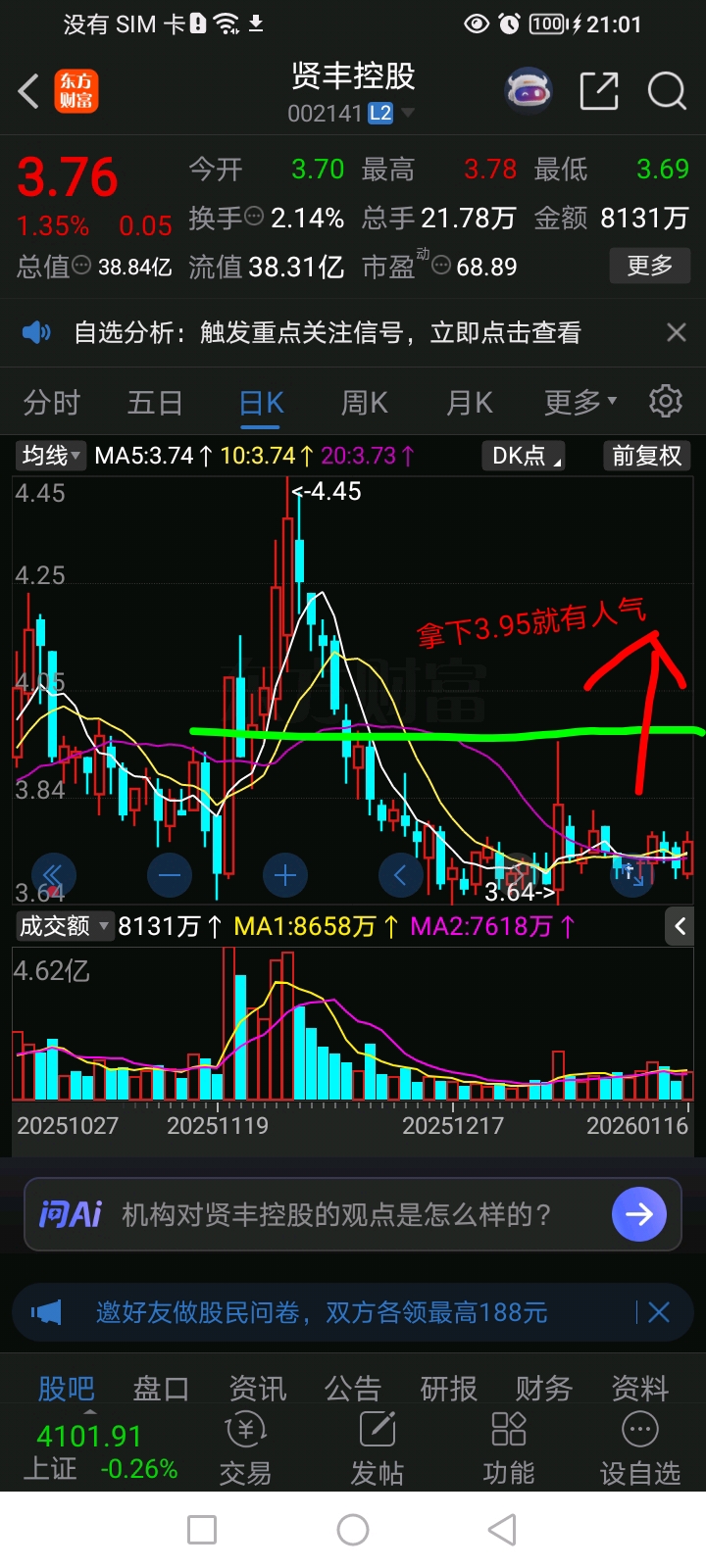 大佬突破这个位置我加仓。3.95说到做到,要不然不买一股。急拉只卖。管住手别被套
