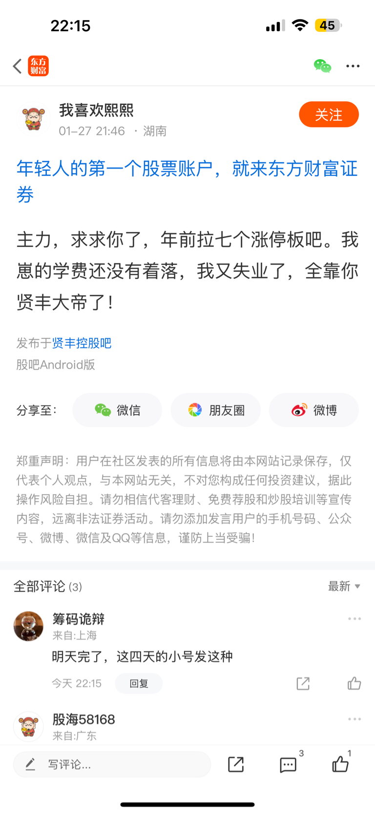 温馨提示: 1.根据《证券法》规定,禁止编造、传播虚假信息或者误导性信息,扰乱证券市场;2.用户在本社区发表的所有资料、言论等仅代表个人观点,与本网站立场无关,不对您构成任何投资建议。用户应基于自己的独立判断,自行决定证券投资并承担相应风险。《东方财富社区管理规定》