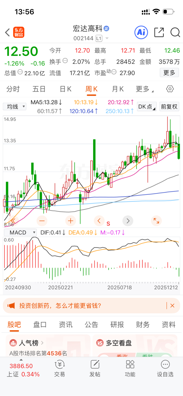 $宏达高科(SZ002144)$ 14上方唱多的,你看看这个走势还难买吗?大盘大涨也扭转不了阴跌走势,今天不涨停都是周线月线一笔下跌,没有几个月如何修复?微盘股大涨它不跟,下跌就带头,轮为了仙股,主力也只想用机器人左右手倒腾赚差价,一天几万就行,没有任何想拉升等想法;外来资金看公司的股东股数更不敢去拉