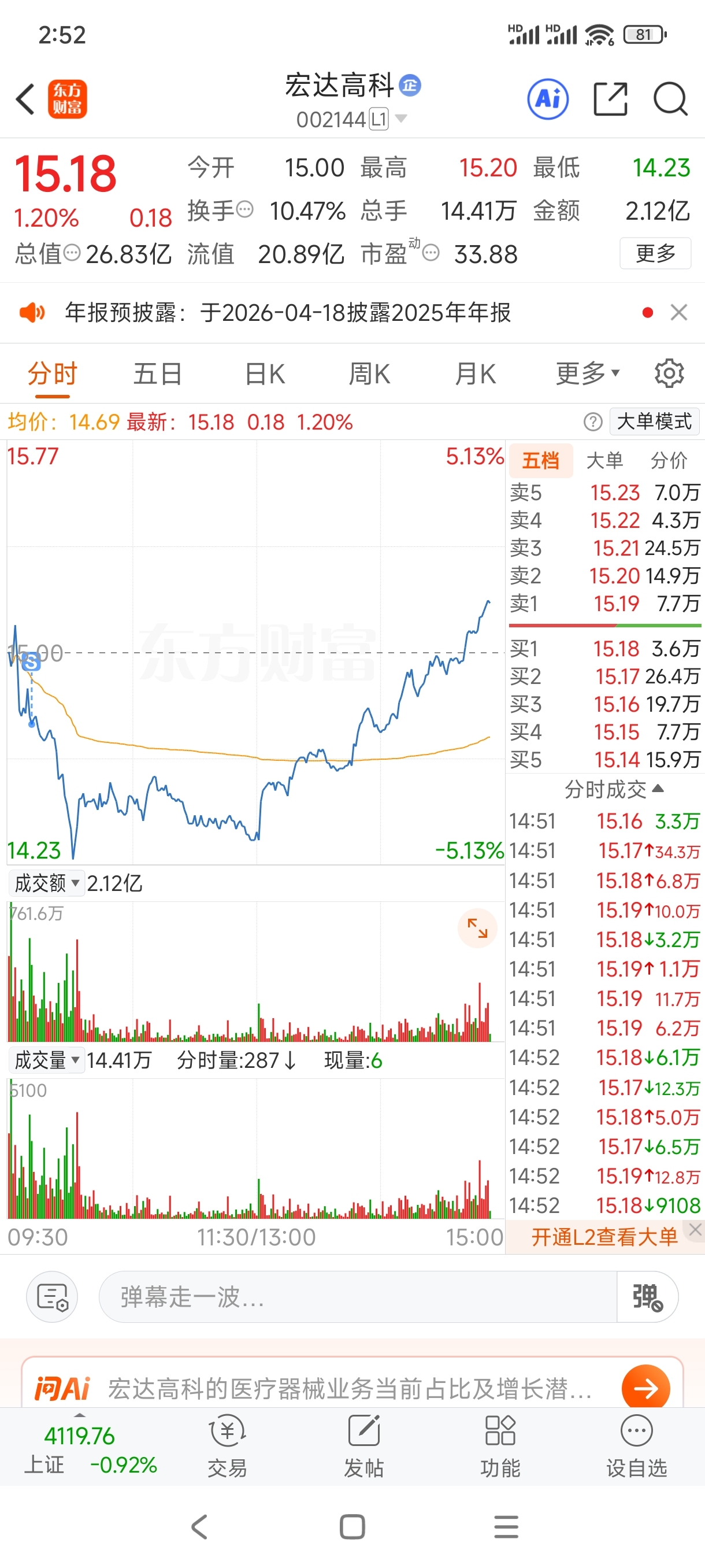 $宏达高科(SZ002144)$ 真恶心啊,本来想早盘冲高卖的,害我亏钱走了,你拉尾盘??