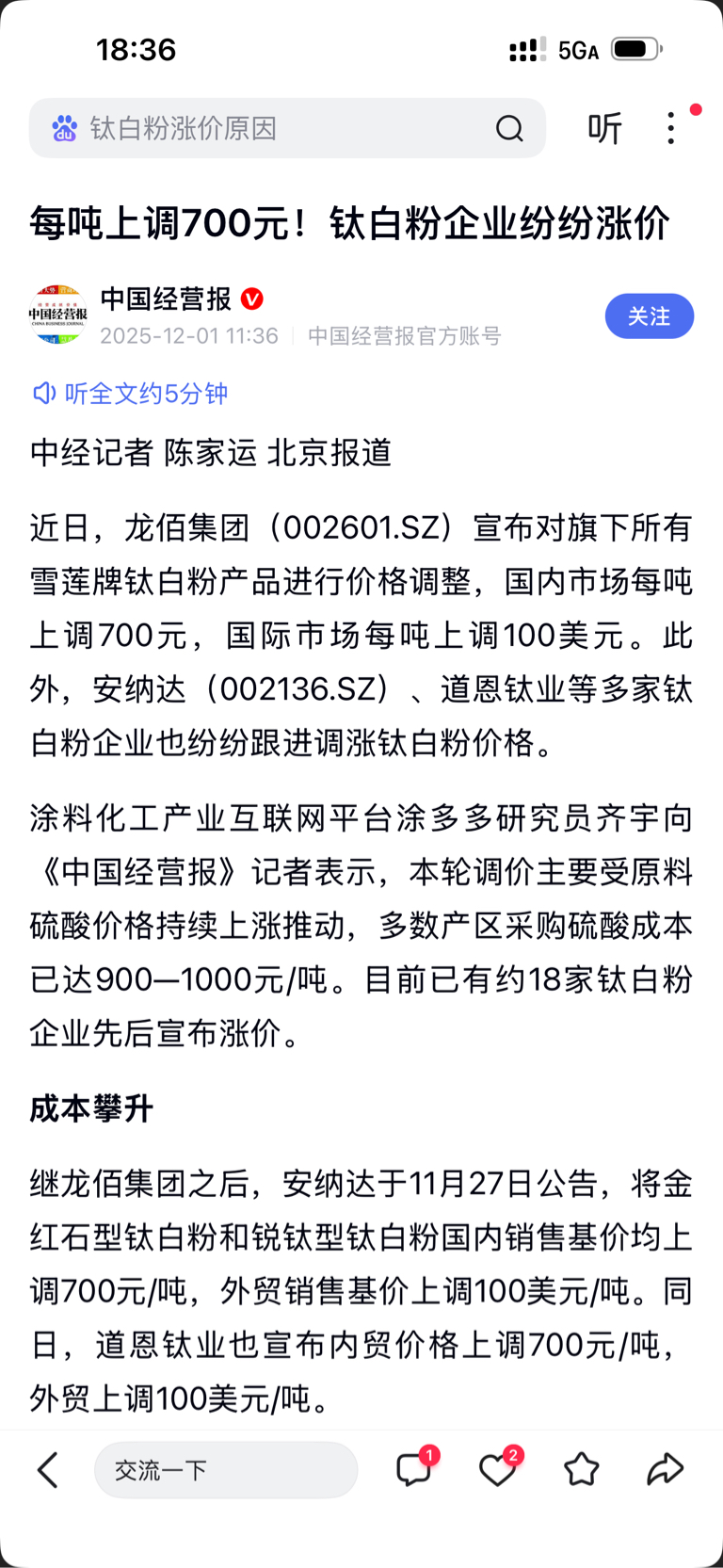 $钛能化学(SZ002145)$ 钛白粉价格能起底回升吗?还是昙花一现!