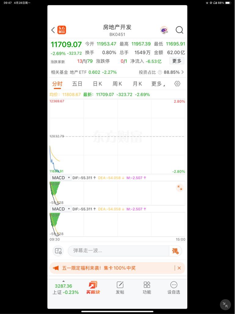 $荣盛发展(SZ002146)$ 和它本身并无多大关联,地产股普跌。大概的可能是,五一利好不及预期。