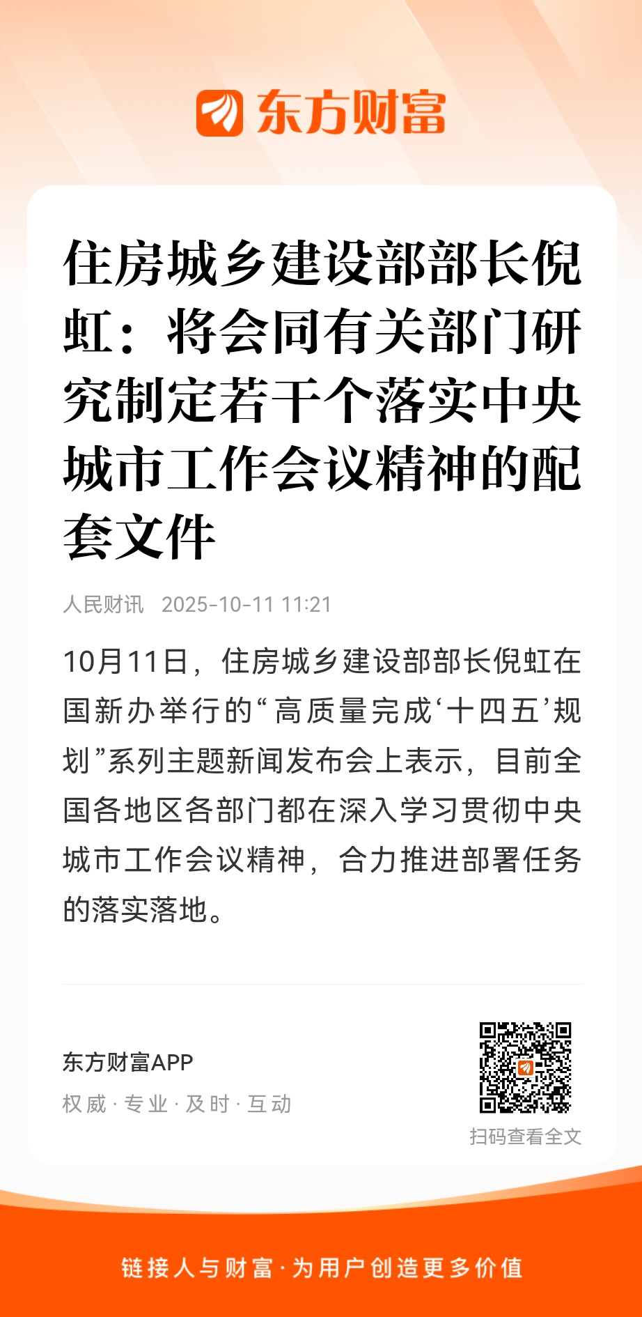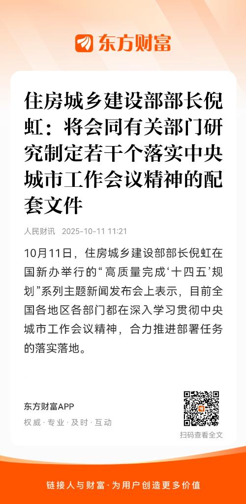 10月11日,住房城乡建设部部长倪虹在国新办举行的“高质量完成‘十四五’规划”系列主题新闻发布会上表示,目前全国各地区各部门都在深入学习贯彻中央城市工作会议精神,合力推进部署任务的落实落地。住建部作为牵头部门,将充分协调指导作用,一方面按照“1+N”的文件体系的工作部署,会同有关部门在意见“1”的基础上来研究制定若干个“N”的配套文件。另一方面来指导各地研究提出落实会议精神的具体工作安排和举措,并且能够纳入当地的“十五五”发展规划。