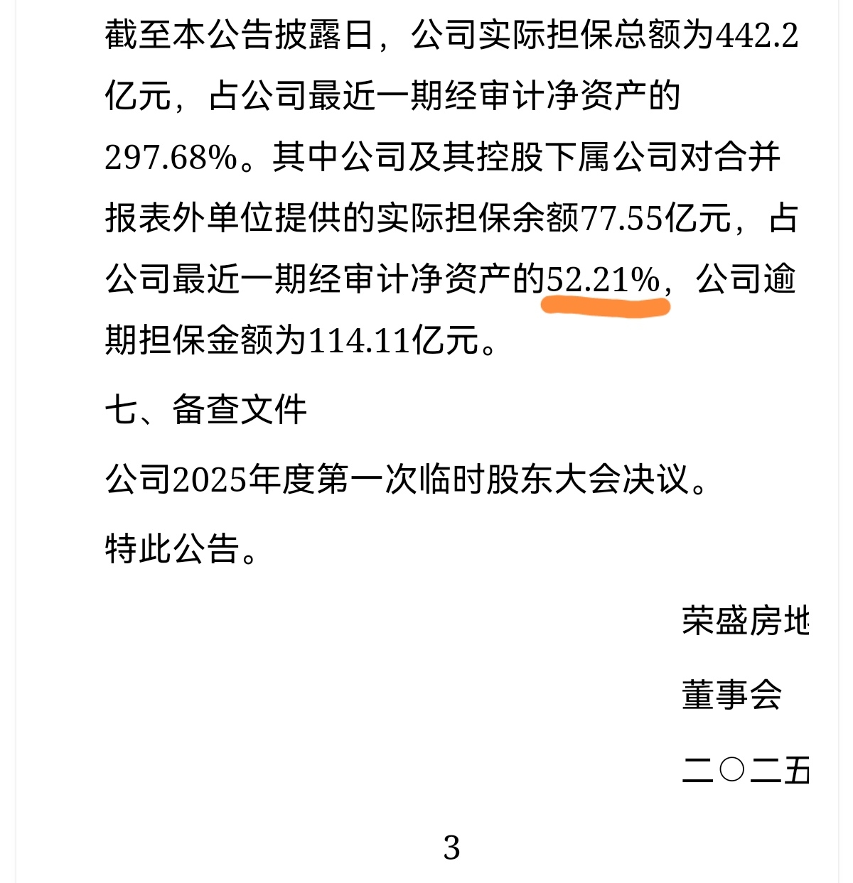 各位完了,荣盛对外担保额已经超过证券法规定的占公司一年净资产的50%了,这是ST