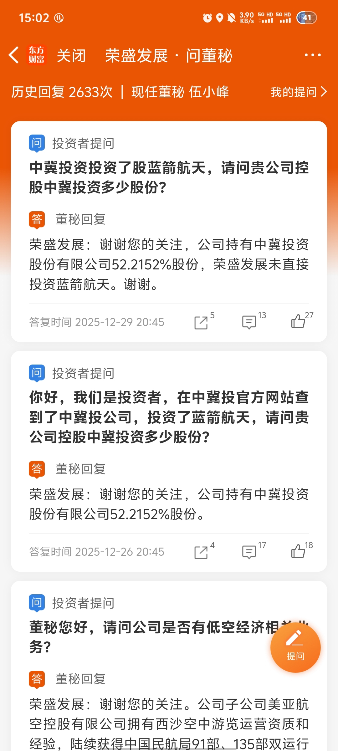 $荣盛发展(SZ002146)$ 董秘26号回复持有中冀投资,29号高开涨停烂板出货。29号晚回复未直接持股蓝箭航天,30号冲高回落近10个点。这还不够明显吗?这是事实,不是唱空。唱多的毫无依据,全靠编。骗人留下来或进来。