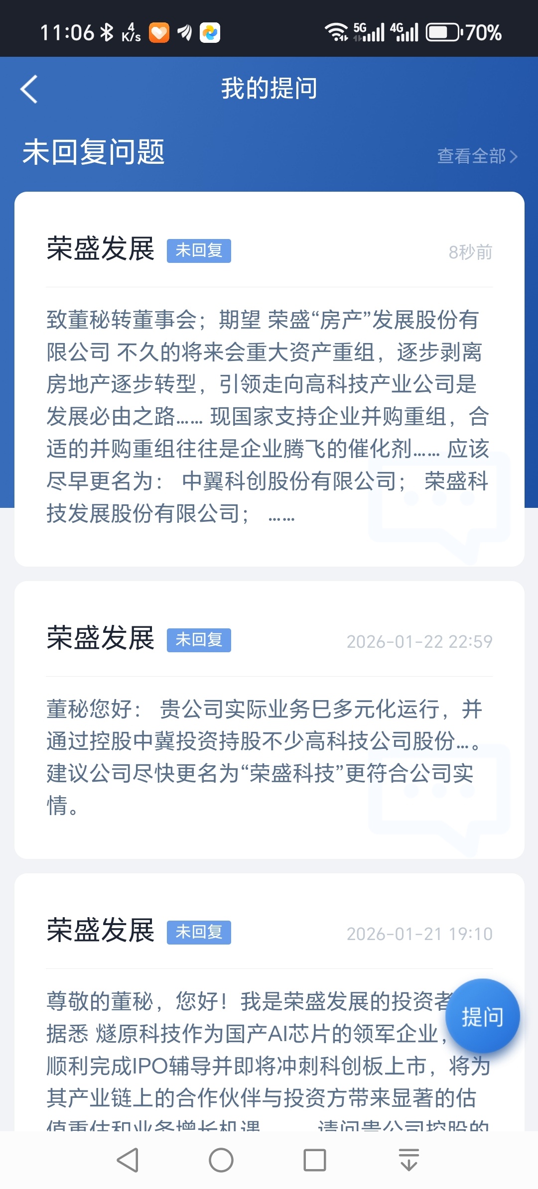 为什么荣盛董秘对股东在深交所《互动易》问董秘平台的多次提问,没空回答?还是装聋作哑?还是其他原因?……