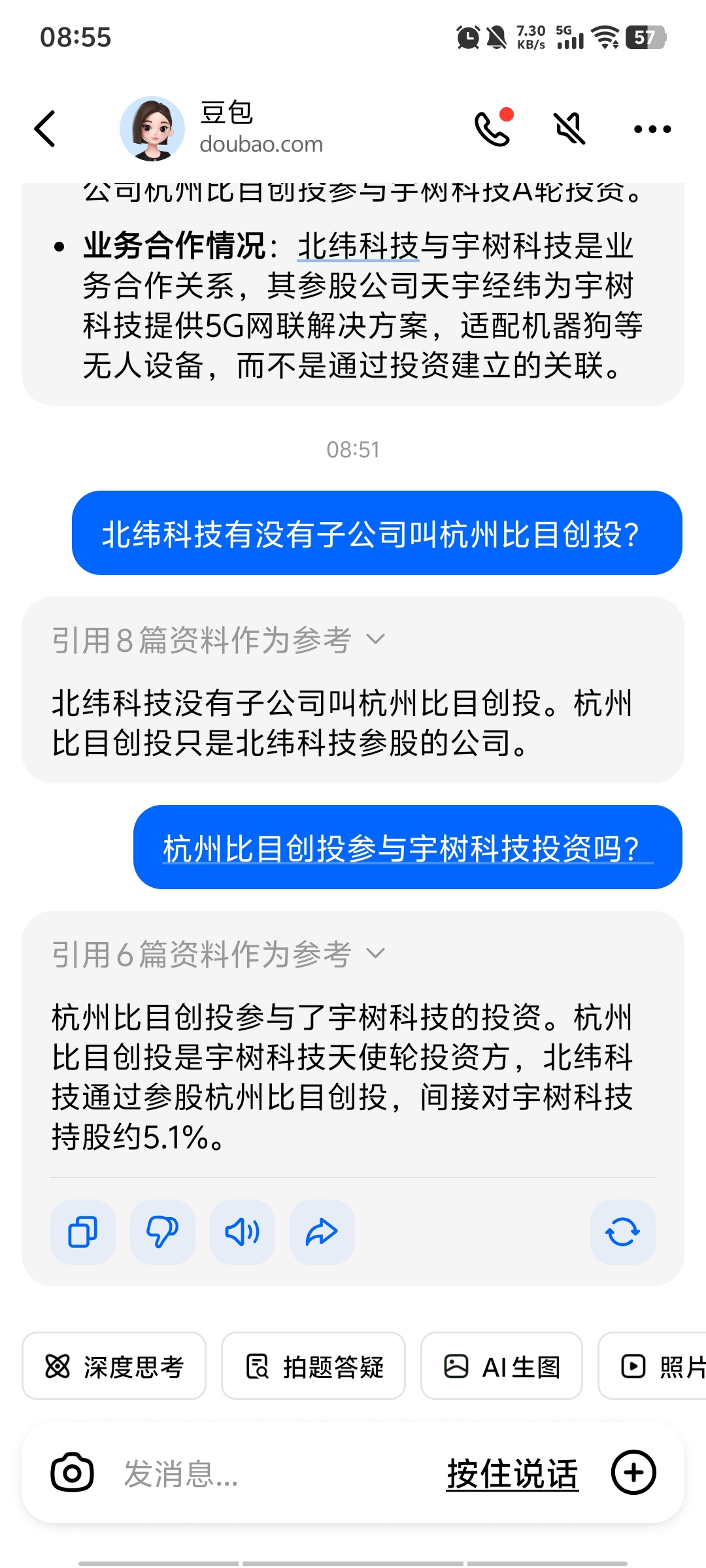 好奇怪问豆包又说比目是北纬参股公司比目参与了宇树天使轮