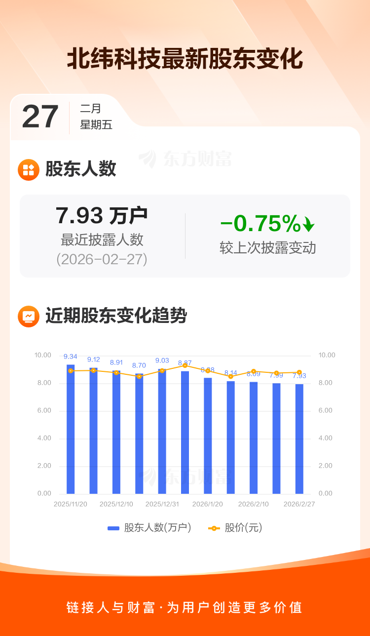 北纬科技:截至2月27日最新股东户数7.93万户,较上期减少0.75%