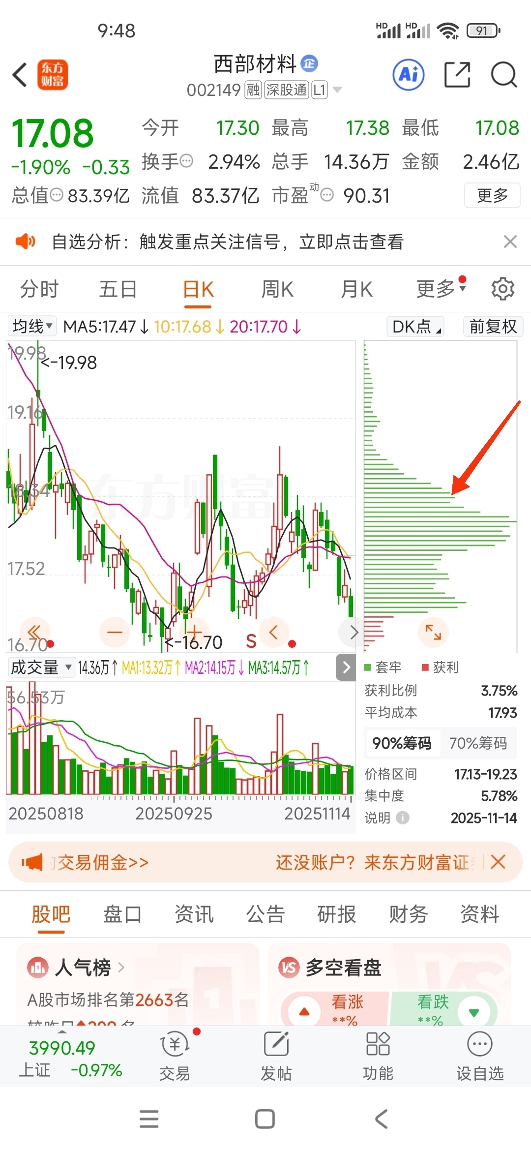 $西部材料(SZ002149)$ 大佬们,这绿绿一大坨筹码峰是散户还是主力呢,lj,你就继续跌吧