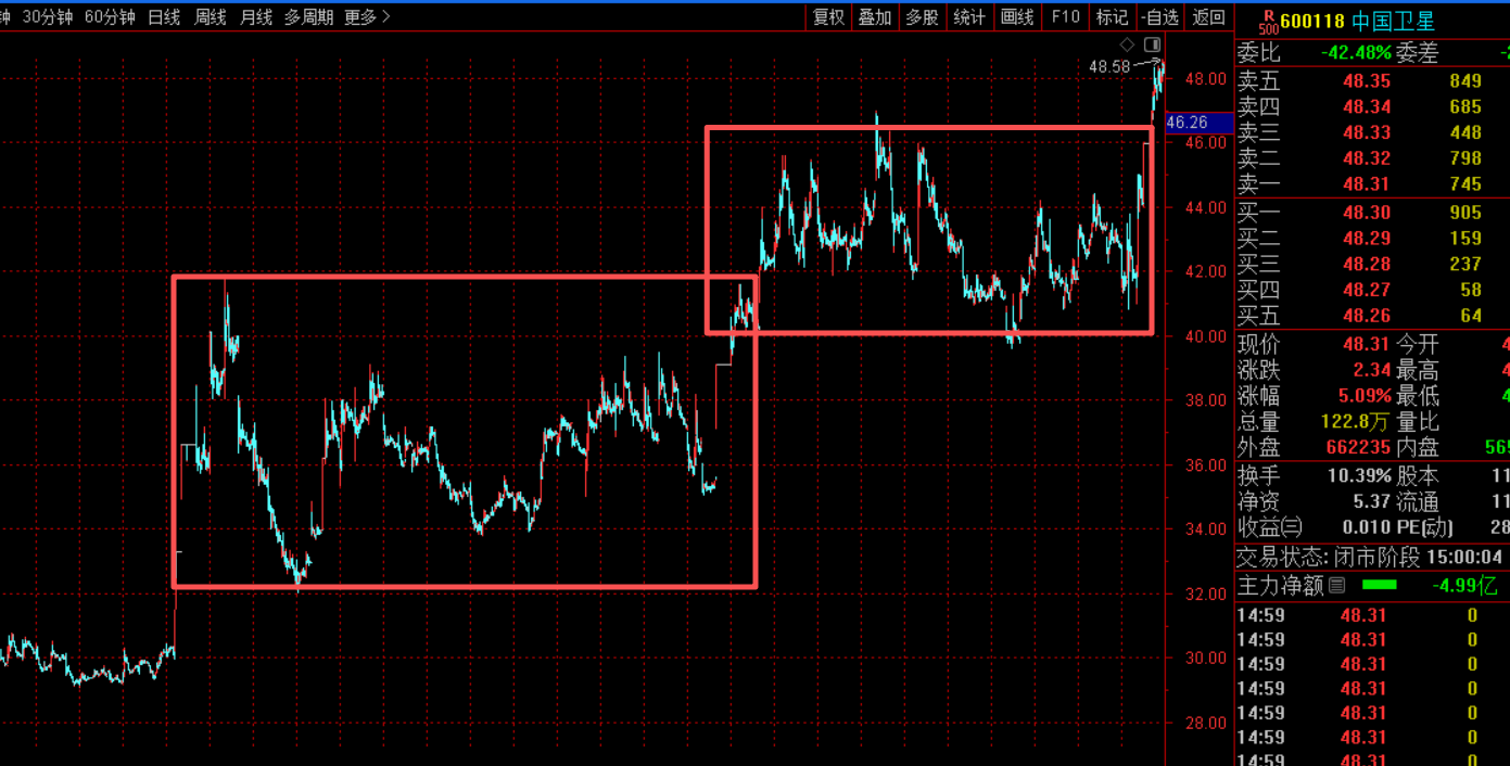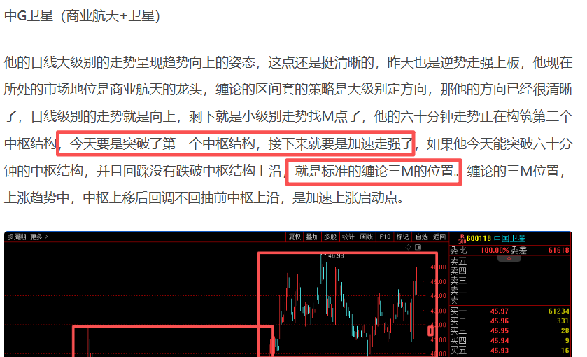 中G卫星今天震荡向上走强,虽然是没有加速走强上板,不过这笔上升趋势是走出来了,商业航天依据是当下市场最强主线题材,它也是当下主线题材里面的趋势中军了,从缠论走势结构拆解来看,正如早上所说,五分钟走势突破了中枢结构,并且回踩没有跌破中枢结构的上沿,符合缠论的三M位置,今天早盘也是按早上的想法入局,按照缠论推演他接下来的走势,应该是要加速走强了。缠论的三M位置出现之后,接下来都是加速上涨的启动点。