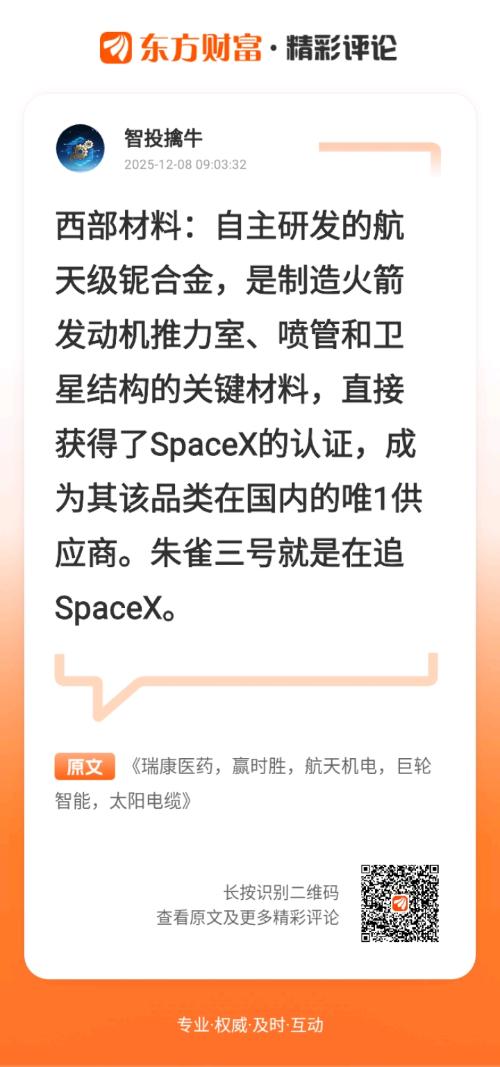 航天机电 $航天机电(SH600151)$,:控谷谷东是航天八院,这可是长征十二号甲可回收火箭的总师单位,技术实力能对标国际顶尖水平,后续核心资产还有注入预期,这靠山够硬;参谷子公司还搞出了墒业航天专用的钙钛矿复合叠层太阳电池技术,航天+光伏双赛道布局;光伏业务有实打实的产能和电站,海外柿场也覆盖了不少家,新能源车领域还跟比亚迪、理想这些大厂有合作,算是多点开花的选手。