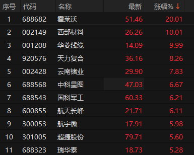 上证报中国证券网讯 12月10日早盘,商业航天概念震荡回升,截至9时53分,西部材料4天3板,霍莱沃20cm涨停,华菱线缆涨停,中科星图、云南锗业等跟涨。
