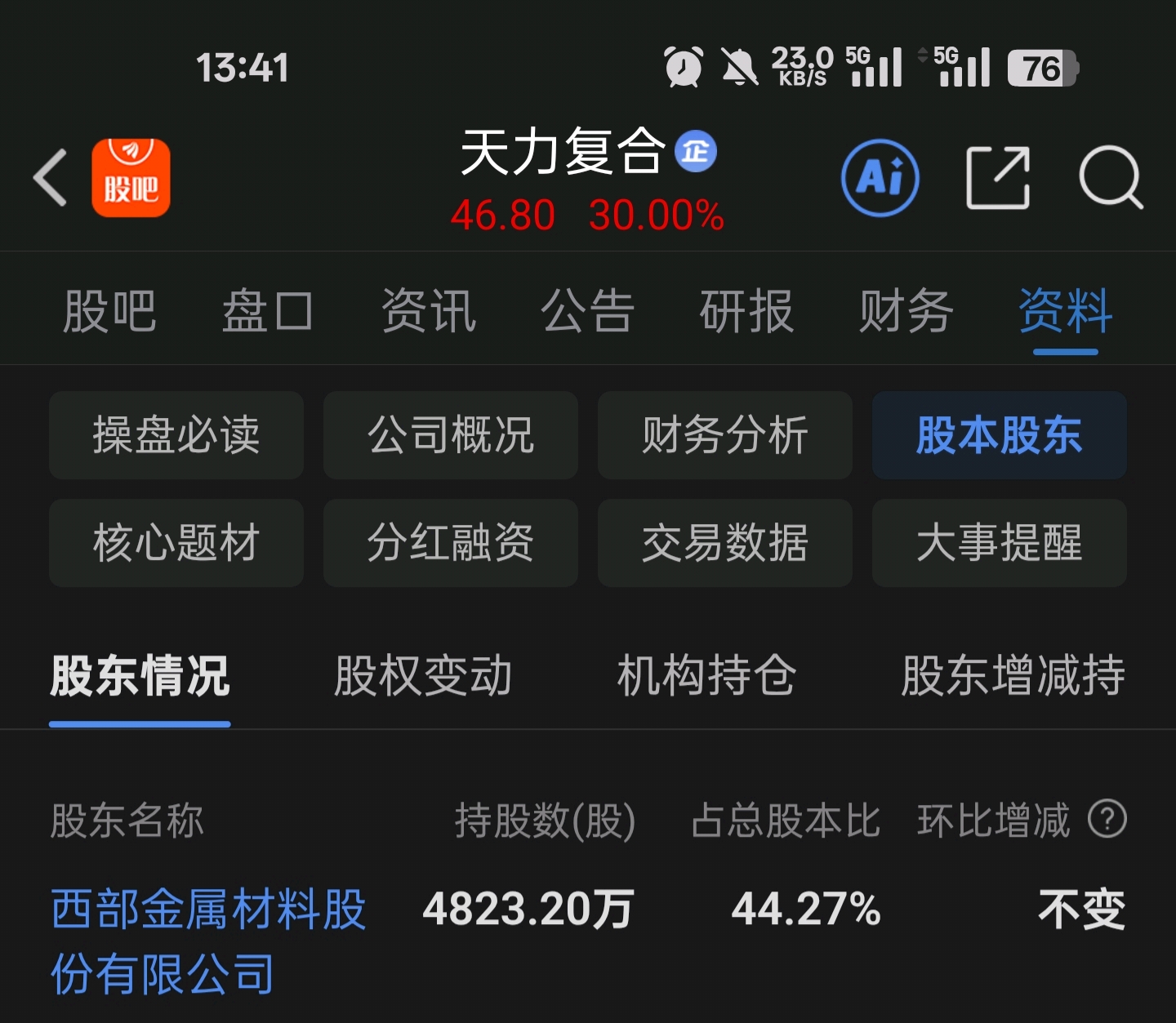 $西部材料(SZ002149)$ 你个大股东不涨???